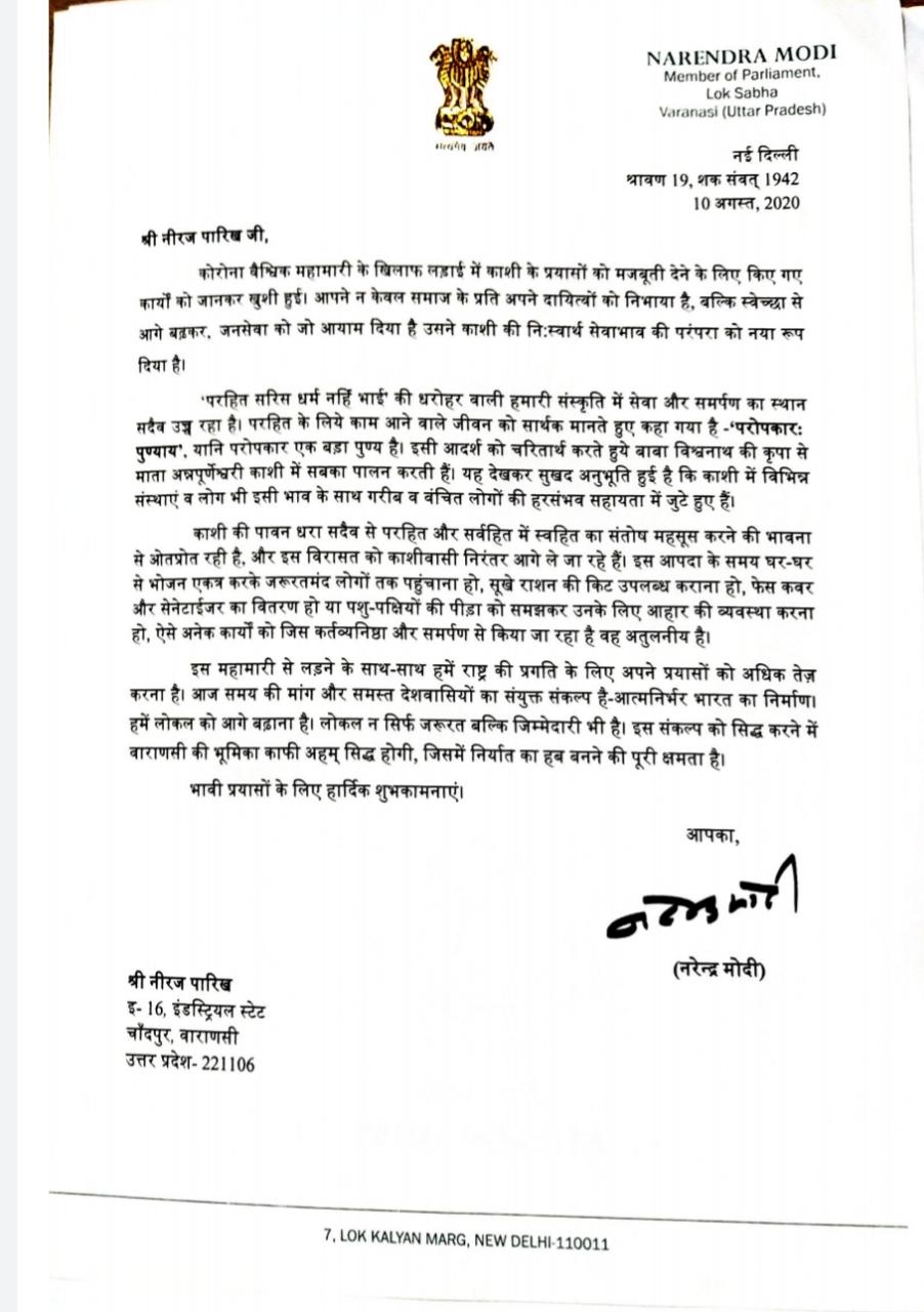 समाज को आप पर गर्व है। वाराणसी समाज के युवा, सक्रिय,ऊर्जावान श्री नीरज पारिख की जन सेवा व परोपकार के लिए आदरणीय प्रधानमंत्री श्री नरेन्द्रजी मोदी ने प्रशंसा की व बधाई दी।